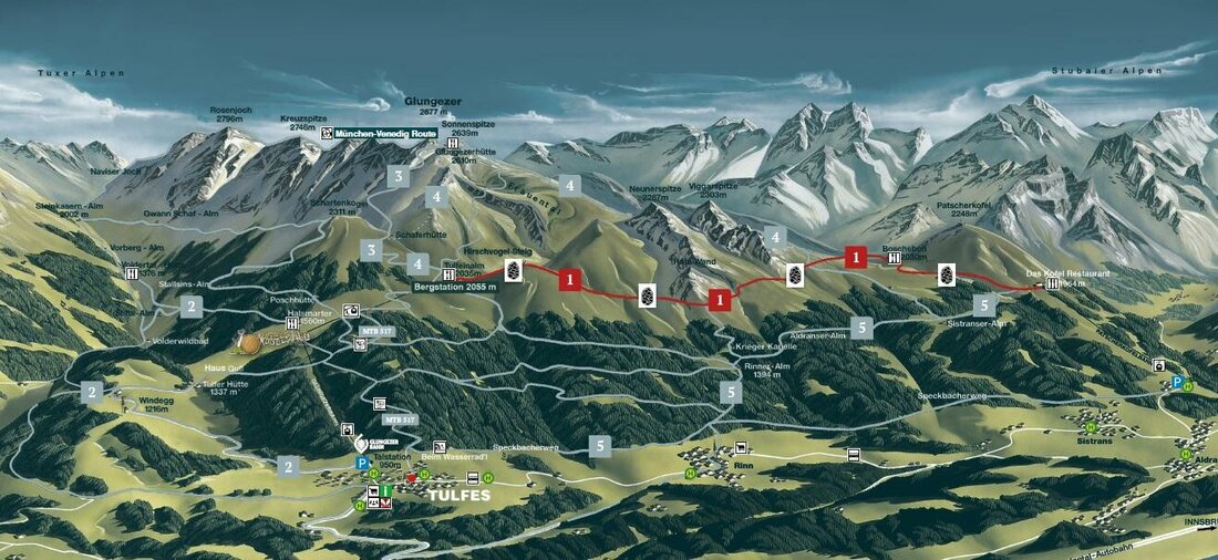 Hike the beautiful natural landscape at the Glungezer. From the village of Tulfes, the gondola lift of the Glungezerbahn takes you comfortably to the middle station Halsmarter (sea level 1567) as well as to the top station Tulfein (sea level 2055). Hiking brochures as well as hiking maps and tour descriptions are available directly at the valley station of the Glungezerbahn.